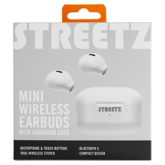 Trådløse mini TWS-hovedtelefoner fra STREETZ med mikrofon, opkalds-/medieknapper, Bluetooth 5 med 10 m rækkevidde og en ergonomisk pasform til behagelig lytning i op til 16 timer med det medfølgende opladningsetui. Perfekte hovedtelefoner til fitnesscentret, løbeturen eller bare til at lytte til musik på rejsen.