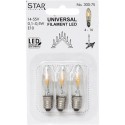 Disse E10 LED-pærer i en 3-pak afgiver et varmt og hyggeligt lys, der skaber en dejlig stemning i adventslysestager, juletræslys og andre dekorationer. De er energieffektive, holdbare og kan bruges både indendørs og udendørs. Fungerer i lysestager med i alt 4-16 lamper.