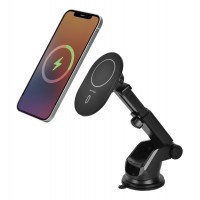 Universal smartphoneholder, der gør det muligt at fastgøre telefonen til forruden eller instrumentbrættet i bilen og nemt dreje den, som du vil. Med indbygget trådløs opladning (op til 15 watt).