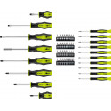 Set med 40 stycken bits och skruvmejslar av olika typer, med stora bekväma handtag och svartoxiderade spetsar.
