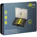 Disse skruetrækkere er fremstillet af hærdet krom-vanadiumstål og er bygget til at holde. Sættet indeholder syv forskellige bits – flade, krydshoved- og stjerneformede T-bits – så du kan udføre alle dine præcisionsopgaver. Den gennemsigtige opbevaringsboks holder alting pænt og overskueligt, mens det kompakte format gør det nemt at have sættet med i værktøjskassen eller tasken. Goobay – til dem, der kræver præcision, kvalitet og smart design i alle detaljer.