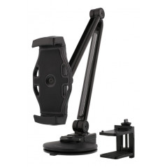 To-i-et-stativ til smartphones og tablets, 4-12 tommer med enten sugekop eller C-klampe til montering på skrivebord. 360 graders rotation og passer til både smartphones og tablets på mellem 4 og 12 tommer.