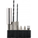 Inkluderar 3x bits (2x stjärna, 1x spår), 1x 2 mm borr, 1x 2,5 mm borr, 1 bits-förlängare och en strömadapter.